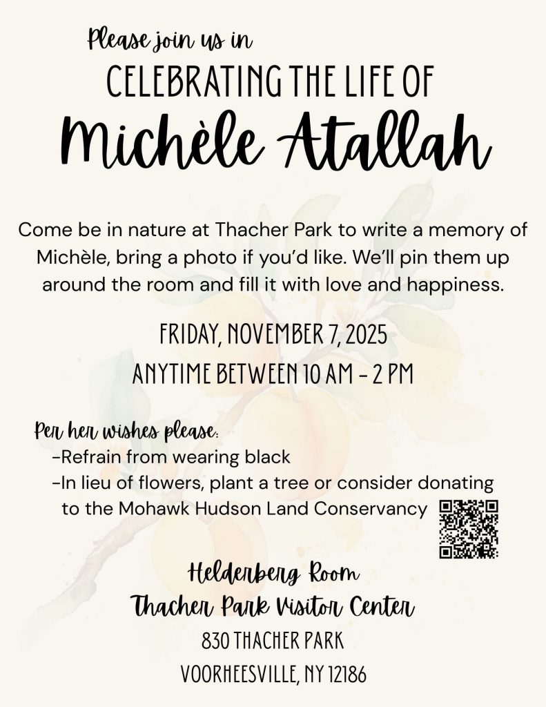 A Celebration of Life for BC French teacher Michele Atallah will be held on Friday, November 7, from 10 a.m. to 2 p.m. at the Thacher Park Visitor Center in Voorheesville. Madame Atallah, a beloved longtime World Language teacher at the high school, passed away on Sunday, November 2.
