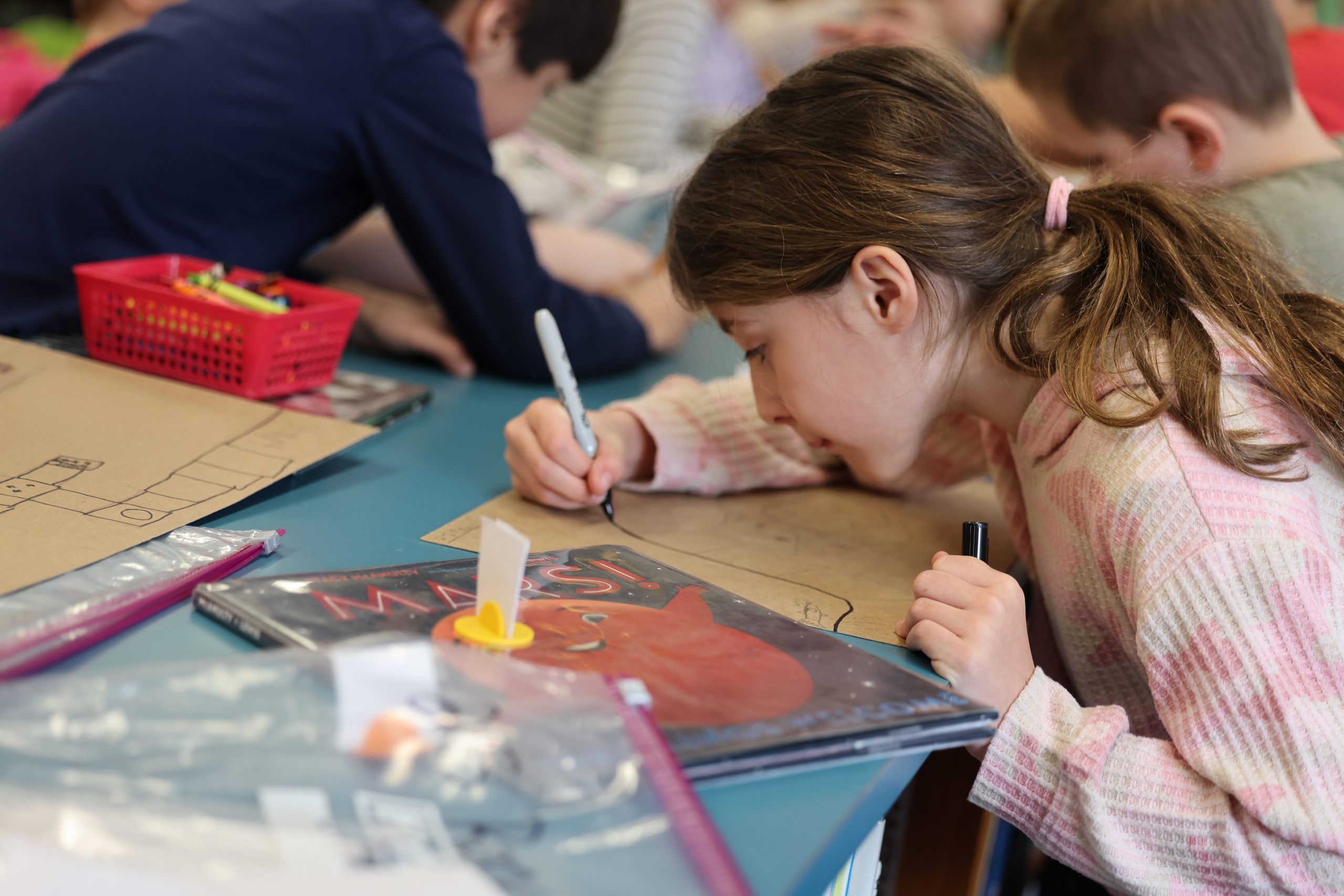 Over the last several weeks, second graders across the district have spent time in their library classes gearing up for McAnulty’s visit by creating board games based on the Our Universe books. Working individually and in small groups, the students used their own creativity and imagination to map and draw unique playing boards, design all of the moving pieces and create “fact cards” using the McAnulty’s books as resource material. (Fact: A day on Mars is 39 minutes and 35 seconds longer than a day on Earth.)