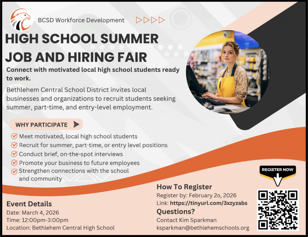 Bethlehem Central School District invites local businesses to participate in our High School Summer Job & Hiring Fair, connecting employers with students seeking summer, part-time, and entry-level work. The fair is a great way for local companies to support student career readiness while meeting potential future employees.